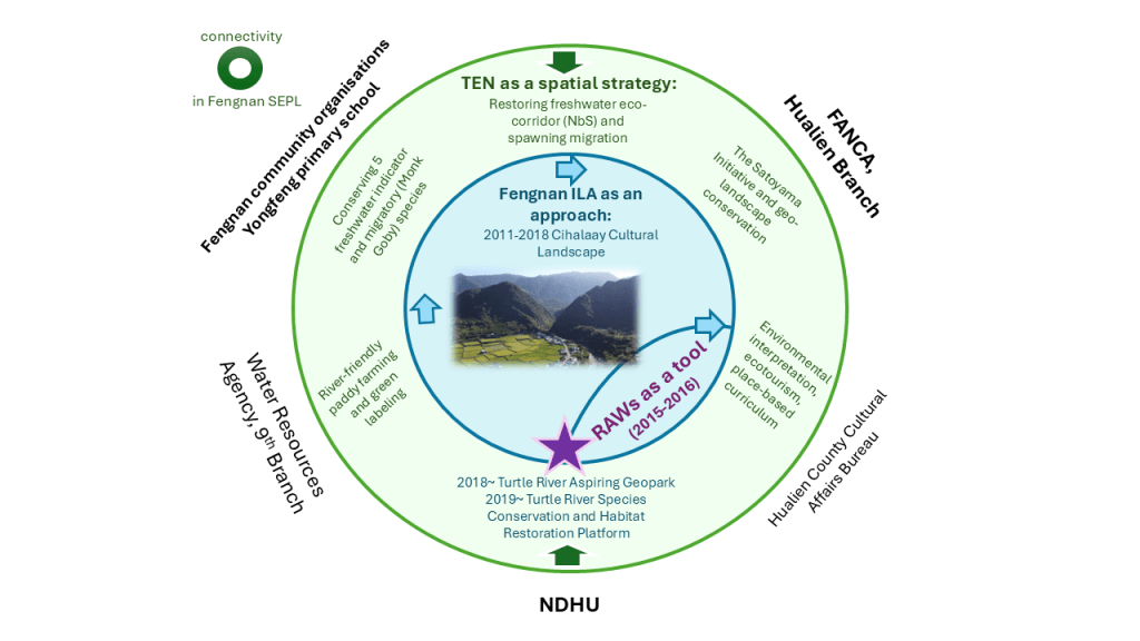 The Fengnan socio-ecological production landscape (SEPL) in Fuli Township, Hualien County, Taiwan, covers 3,289 ha. It lies in the uppermost reaches of the Turtle River, the southernmost tributary of eastern Taiwan’s Xiuguluan River. Fengnan SEPL is home to Amis, Hakka, and Hokkien communities, with Indigenous Amis people forming the majority and contributing rich knowledge of hunting, farming, foraging, and wild plants. Fengnan’s unique upstream location, diverse geology, and long history of nature–culture interactions have made it a leading example of integrated landscape approach in Taiwan. Since 2011, the Cihalaay Cultural Landscape has showcased early Satoyama Initiative practices and community-led conservation. Local efforts have strengthened eco-friendly rice farming, improved stream and farmland connectivity, and addressed human–wildlife conflicts. The community’s close relationship with the endemic monk goby (Hala) inspired the creation of the award-winning “Hala Rice” brand in 2016. In recent years, Fengnan has expanded its vision through the Turtle River Aspiring Geopark and the Turtle River Species Conservation and Habitat Restoration Platform, focusing on geodiversity, freshwater species conservation, and sustainable local livelihoods. These collaborations led to the launch of the “Turtle River Rice” brand in 2022, highlighting Fengnan’s ongoing commitment to living in harmony with its river landscape.