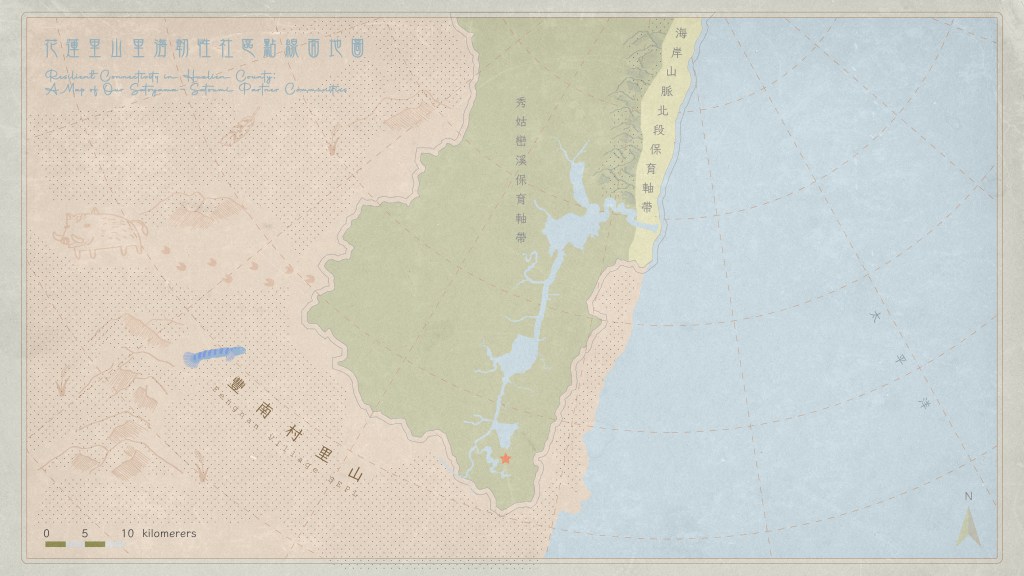 花蓮縣富里鄉豐南村社會─生態生產地景(SEPL)面積 3,289 公頃,位於秀姑巒溪最南端上游支流——鱉溪上游流域。這裡由阿美族、客家及閩南族群共同居住,其中阿美族佔六成以上,擁有狩獵、耕作、採集與野生植物利用等豐富的在地知識。依託其獨特的上游位置、多樣的地質地貌,以及百年來的人地互動傳統,豐南成為台灣地景整合取徑的先行示範。2011年成立的「Cihalaay 文化景觀」是國內最早的里山倡議實踐場域之一。社區長期推動友善耕作、串聯田區與溪流生態廊道、改善地景多樣性,以及協助處理人與野生動物衝突。社區與鱉溪特有洄游魚日本禿頭鯊(阿美語名為哈拉)的深厚連結,更催生了 2016 年獲獎的「哈拉米」品牌。近年來,透過「鱉溪地質公園籌備平台」與「物種保育與棲地復育平台」,豐南持續深化地質多樣性、河川生態保育與永續生計的合作,其成果亦促成 2022 年「鱉溪米」品牌的誕生,展現社區與河川地景和諧共生的願景。