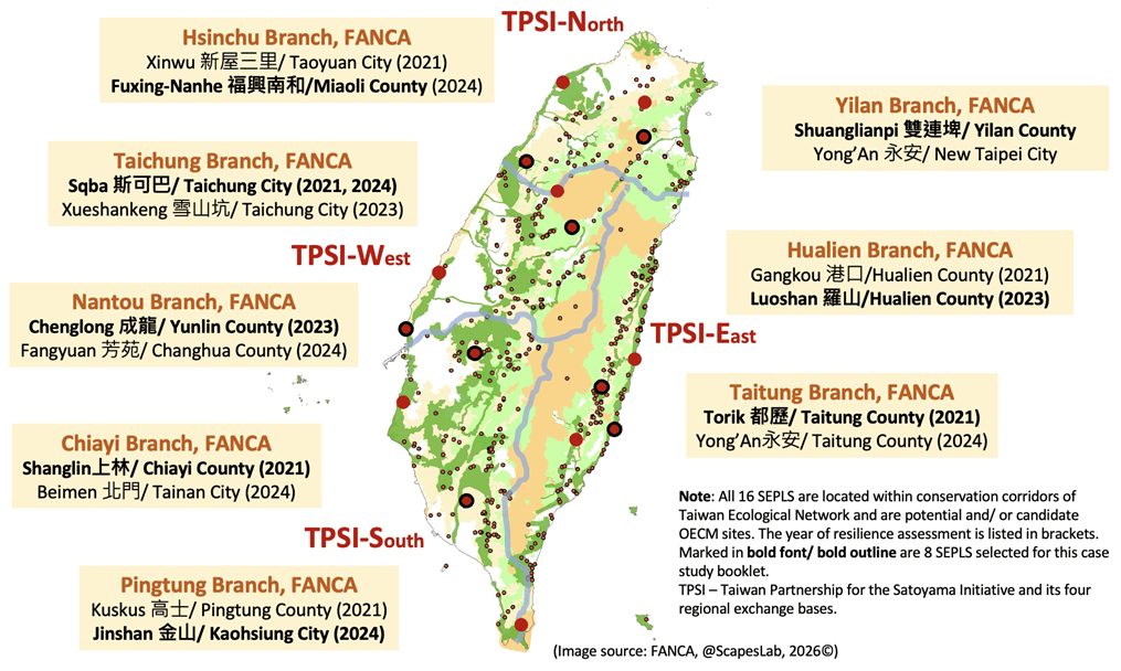 Implemented through eight regional branches of FANCA — each supporting two SEPLS sites over a five-year period — the initiative was facilitated through the Taiwan Partnership for the Satoyama Initiative (TPSI), with strong coordination provided by its regional exchange bases: the Dharma Drum Institute of Liberal Arts (TPSI-North), Taiwan Biodiversity Research Institute (TPSI-West), National Pingtung University of Science and Technology (TPSI-South), and National Dong Hwa University (TPSI-East). Together, these institutions played key roles in coordination, facilitation, and cross-regional learning, helping translate resilience assessment from a shared framework into locally grounded practice across diverse SEPLS contexts.