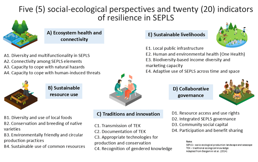 Yet a practical challenge follows: how can SEPLS resilience be understood, discussed, and assessed? Unlike human health, SEPLS do not require thermometers or laboratory tests. Instead, community-based resilience assessment workshops (RAWs), built around five social-ecological perspectives (ABCDE) and twenty Indicators of Resilience in SEPLS, provide a structured way for communities and practitioners to reflect collectively on ecological, social, cultural, governance, and economic conditions.