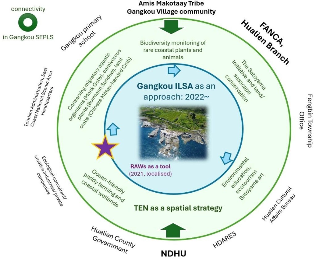 Community-based conservation in Gangkou has deep roots, dating back to Forestry and Nature Conservation Agency’s (FANCA’s) terraced paddy restoration project (2009–2010) and biodiversity surveys (2016). Since 2018, Taiwan Ecological Network (TEN) spatial planning efforts have guided the revitalisation of this landscape–seascape biodiversity hotspot. In 2021, resilience assessment workshops (RAWs) were introduced, and—building on the Xinshe SEPLS experience—the first Gangkou-localised set of 20 SEPLS indicators was developed. The workshops highlighted urgent priorities: improving connectivity between natural waterways and irrigation channels, securing household water quality, addressing declines in freshwater and marine species, strengthening community-based coastal and river protection, managing invasive alien species, and enhancing connectivity with neighbouring SEPLS along the Xiuguluan River.